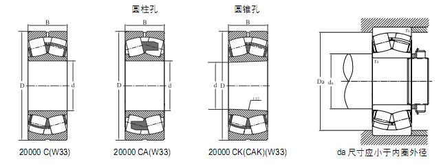 b、具有自動調心的功能,即內圈軸線相對外圈軸線有較大傾斜時(一般在3度以內)仍能正常運轉